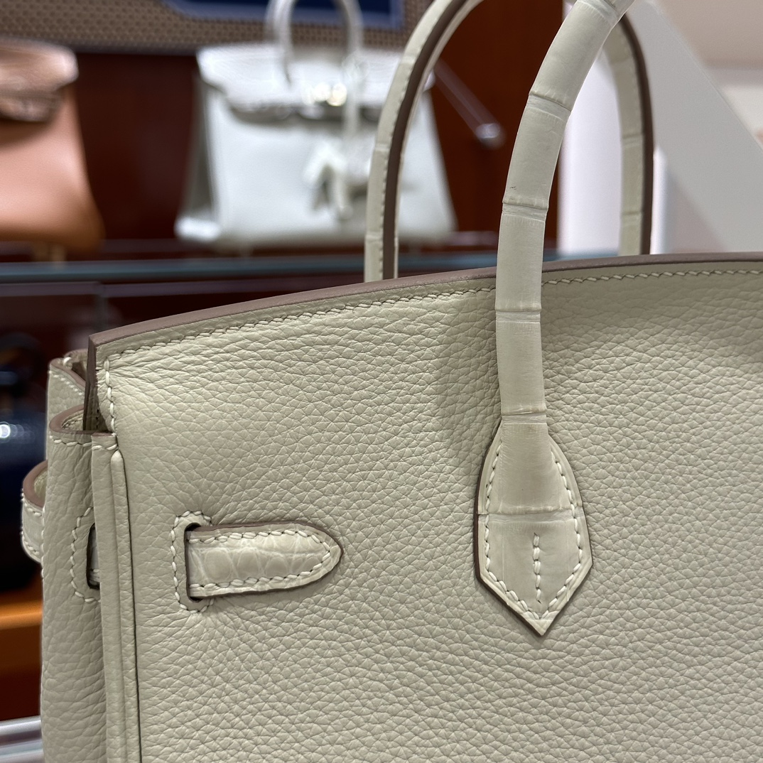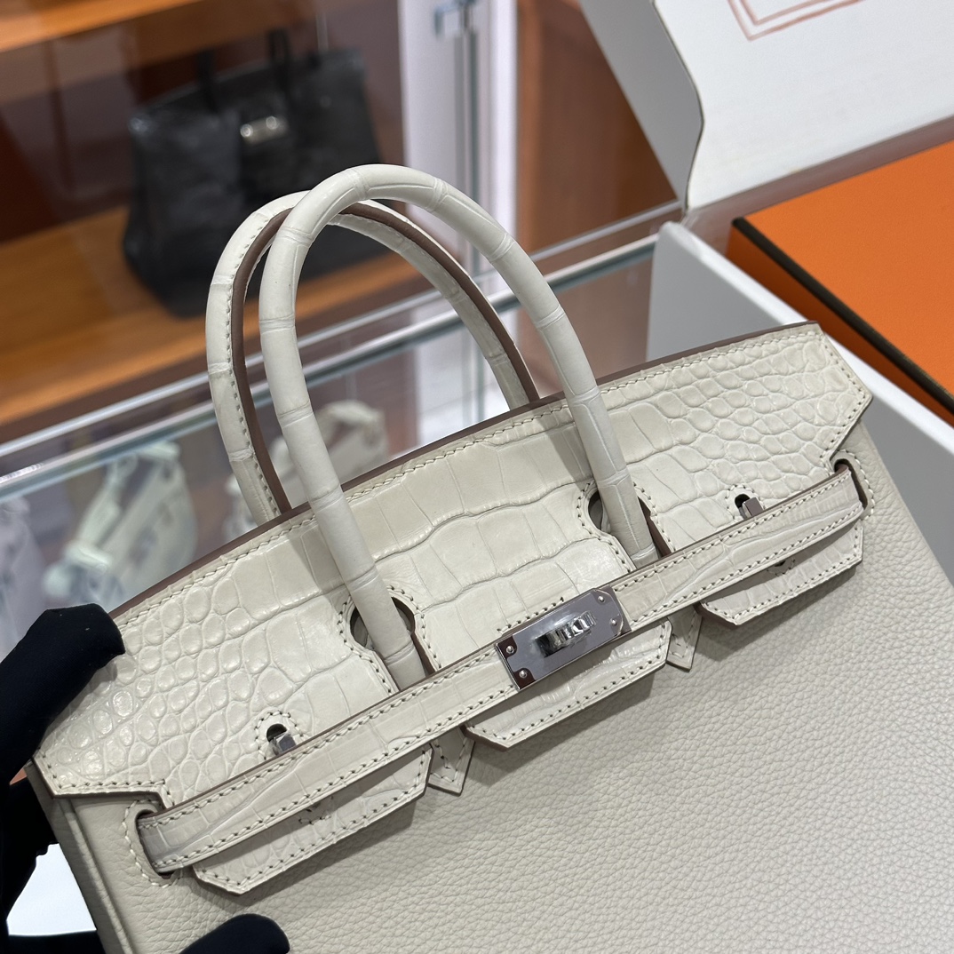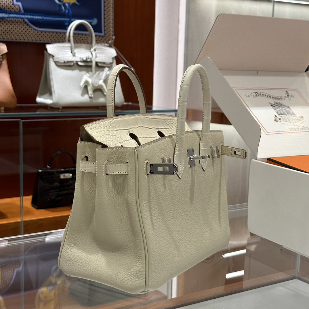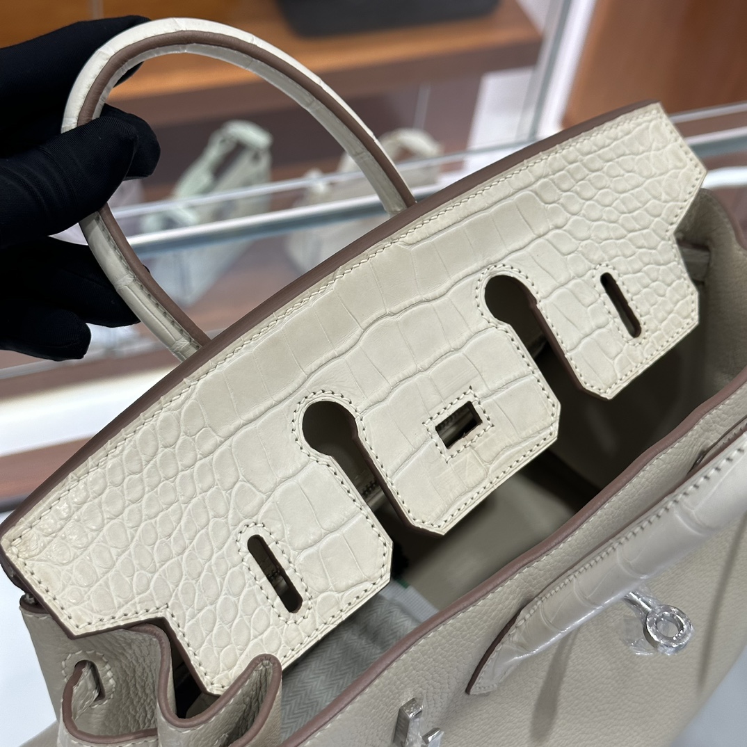 DDMode Factory Birkin Touch Togo & Matte Alligator Crocodile Cream White Silver Hardware 25cm Full Handmade