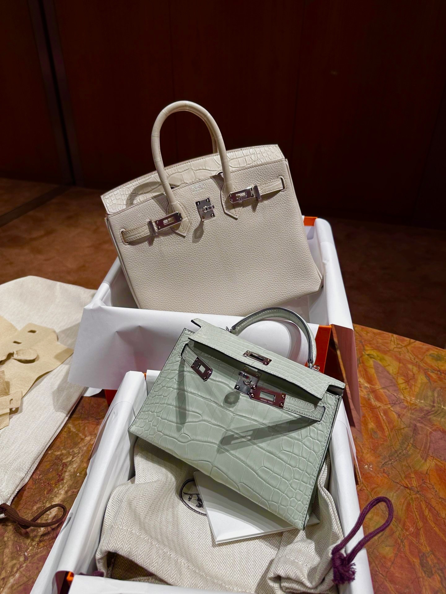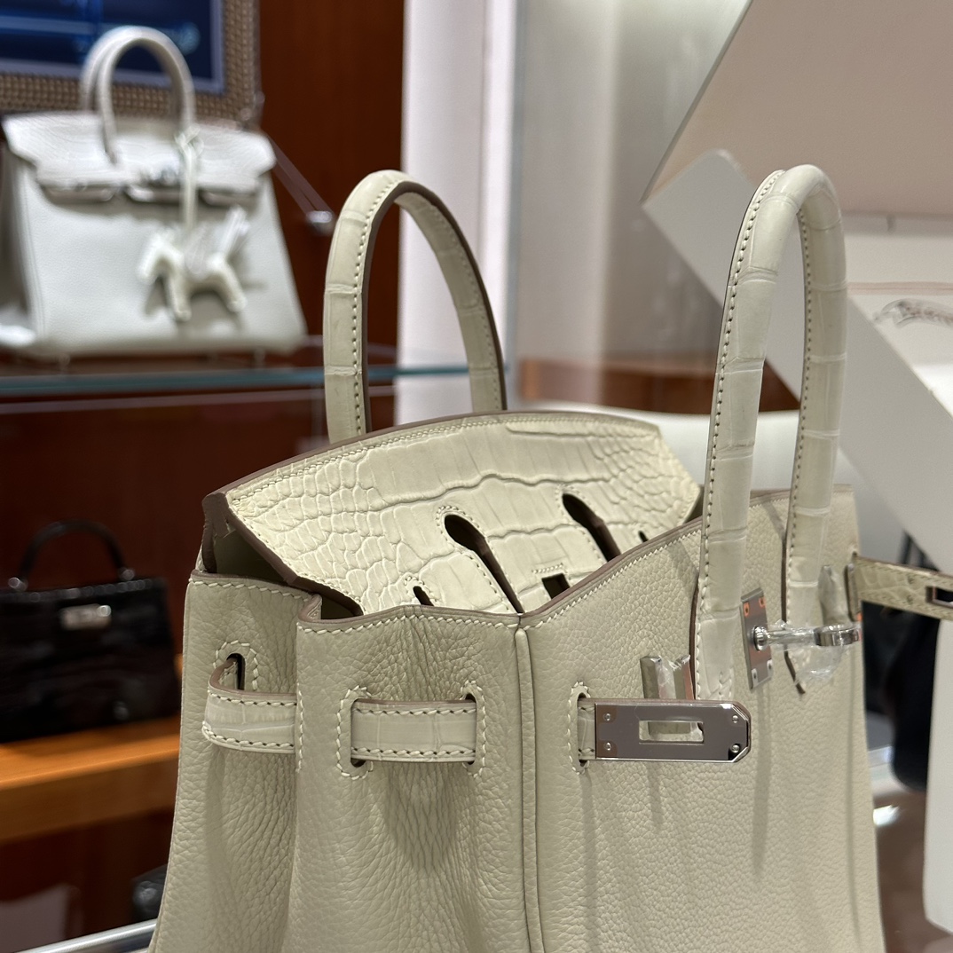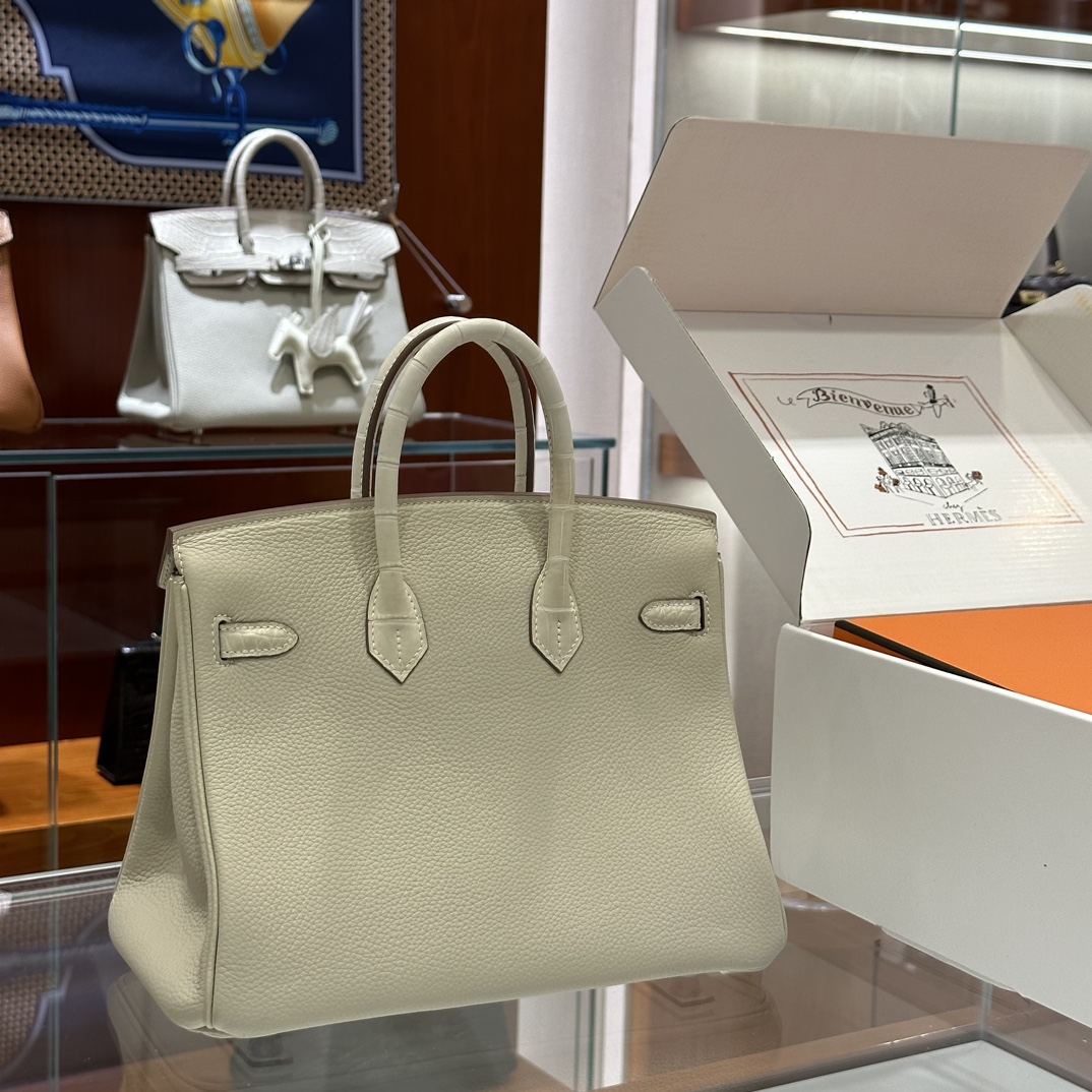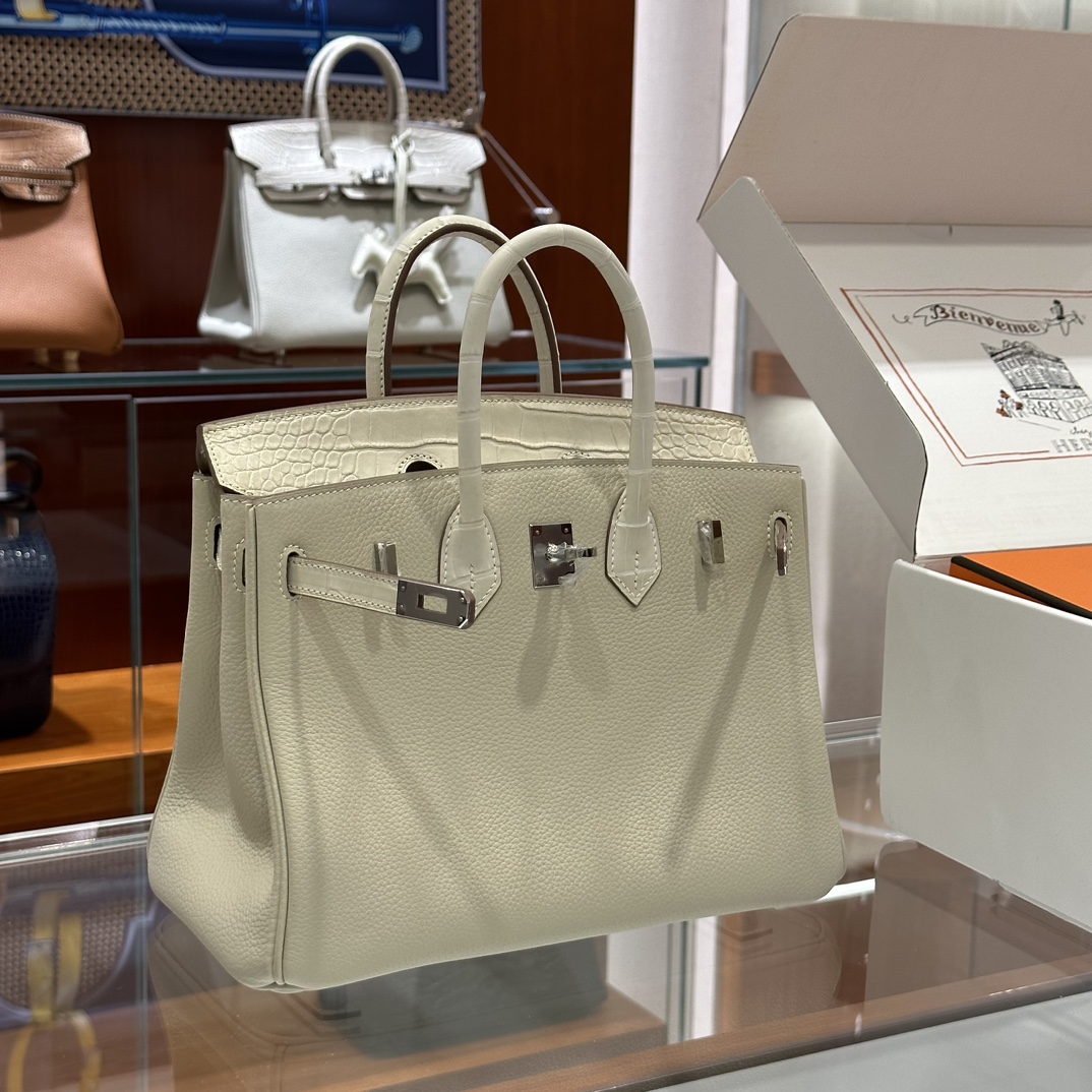 DDMode Factory Birkin Touch Togo & Matte Alligator Crocodile Cream White Silver Hardware 25cm Full Handmade