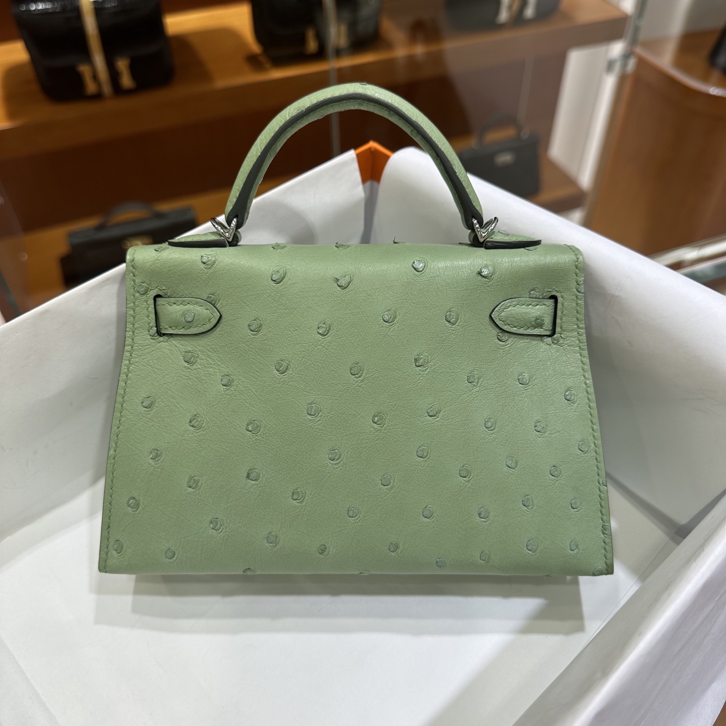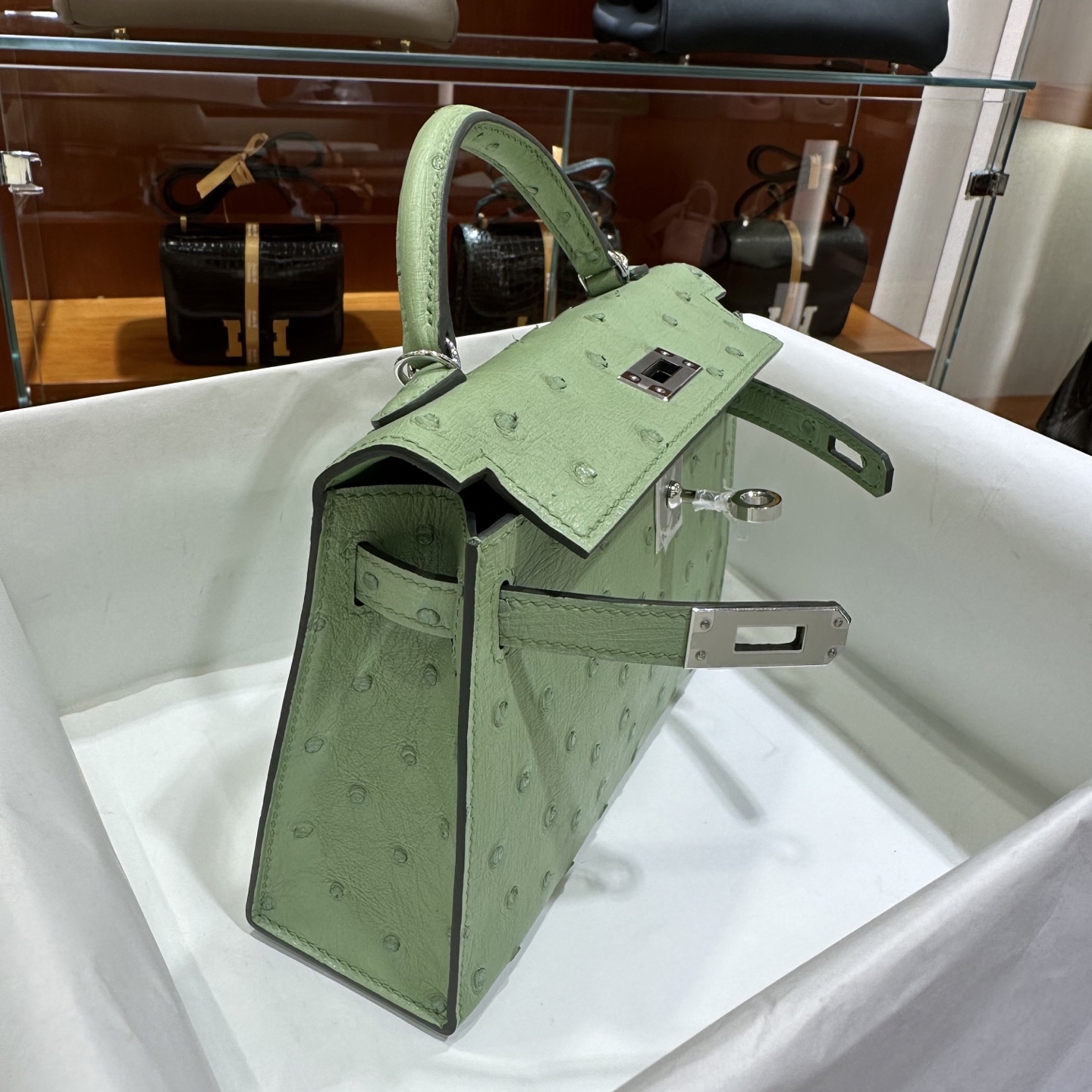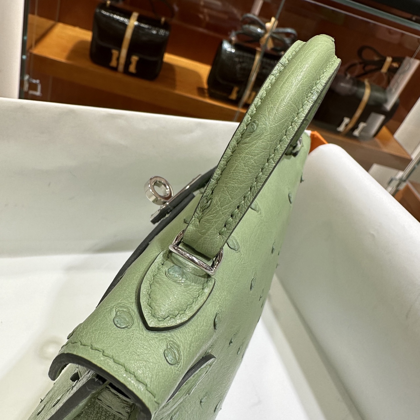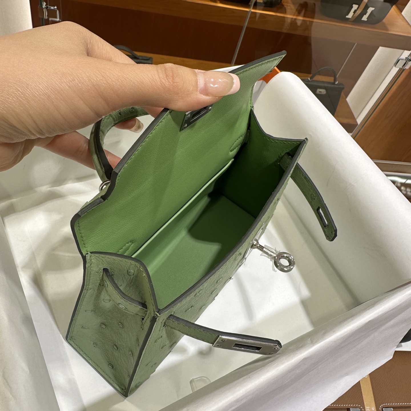 DDMode Mini Kelly Ostrich Leather 3i Avocado Green Silver Hardware 19cm Full Handmade
