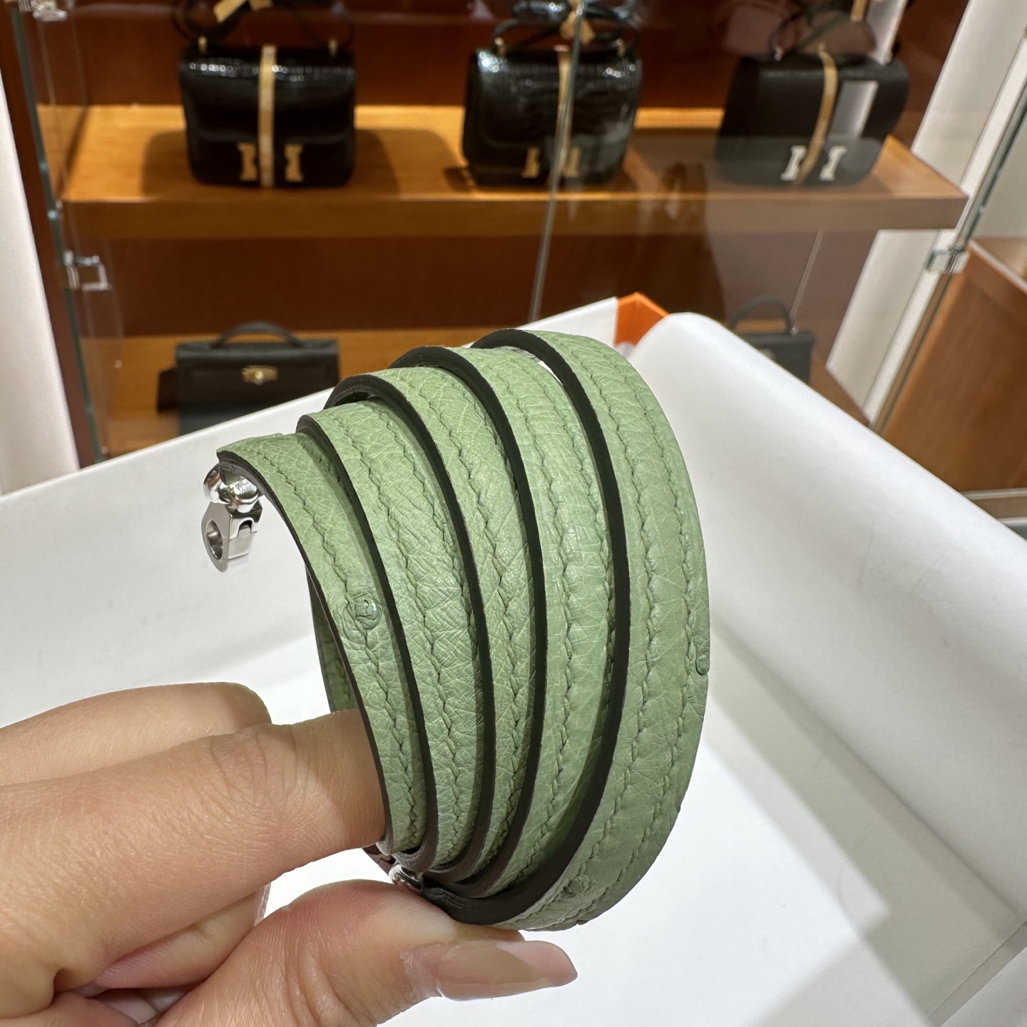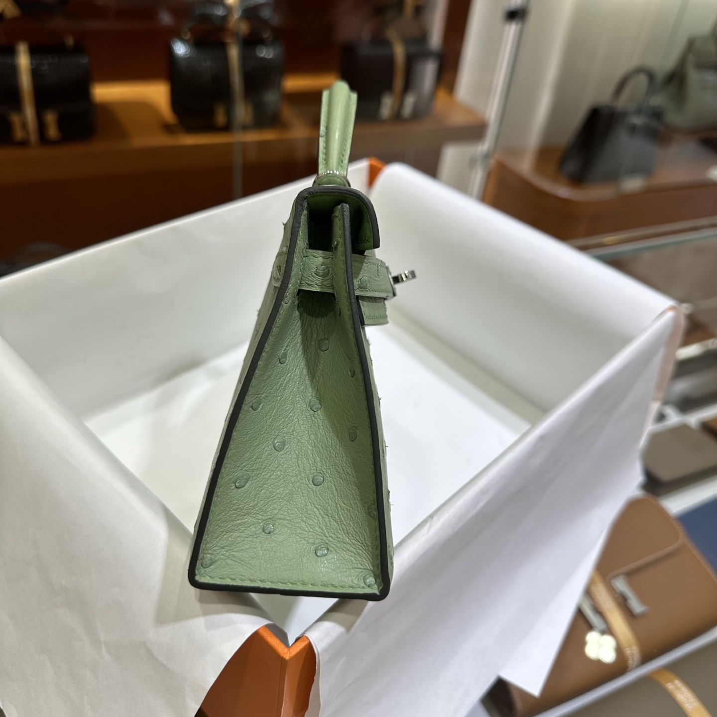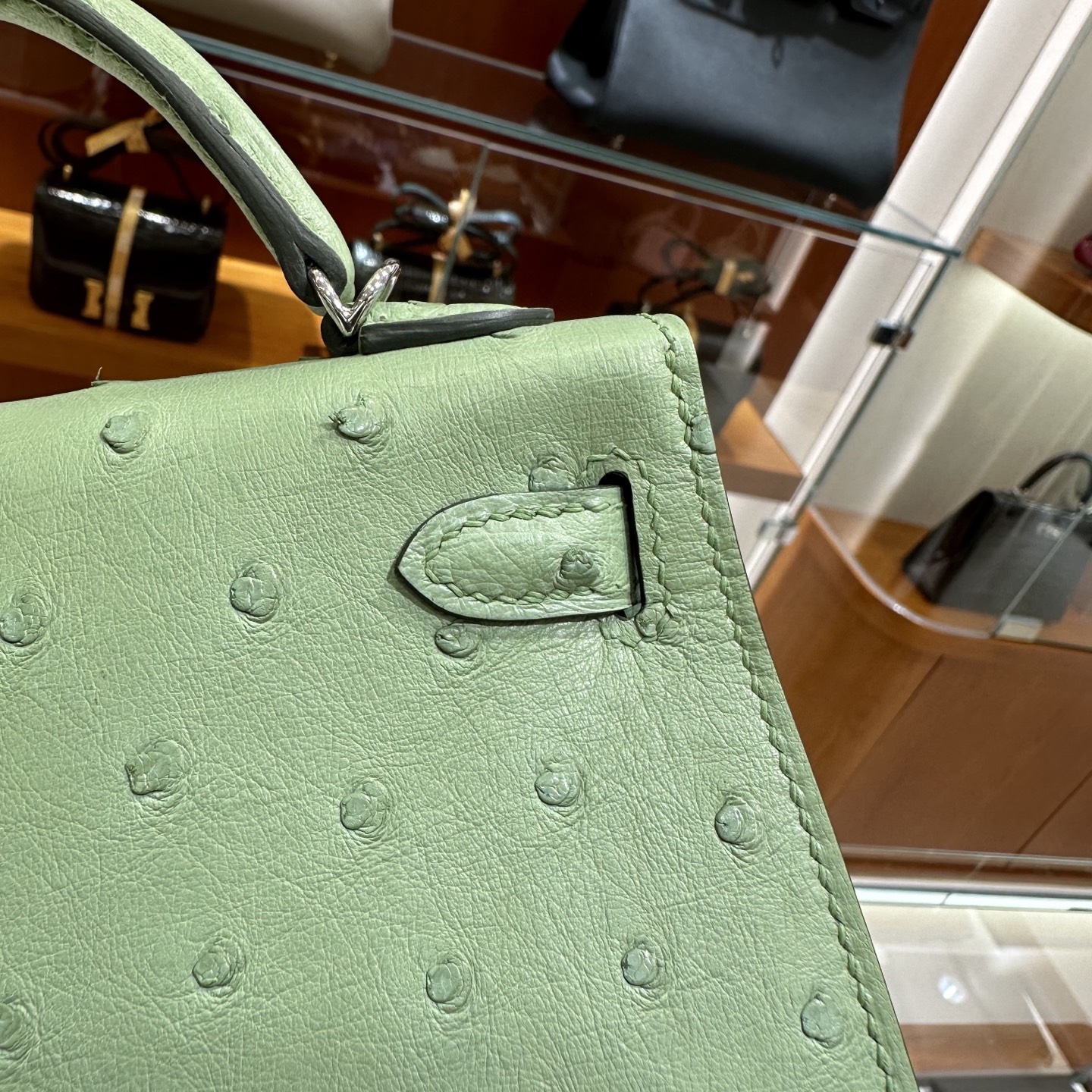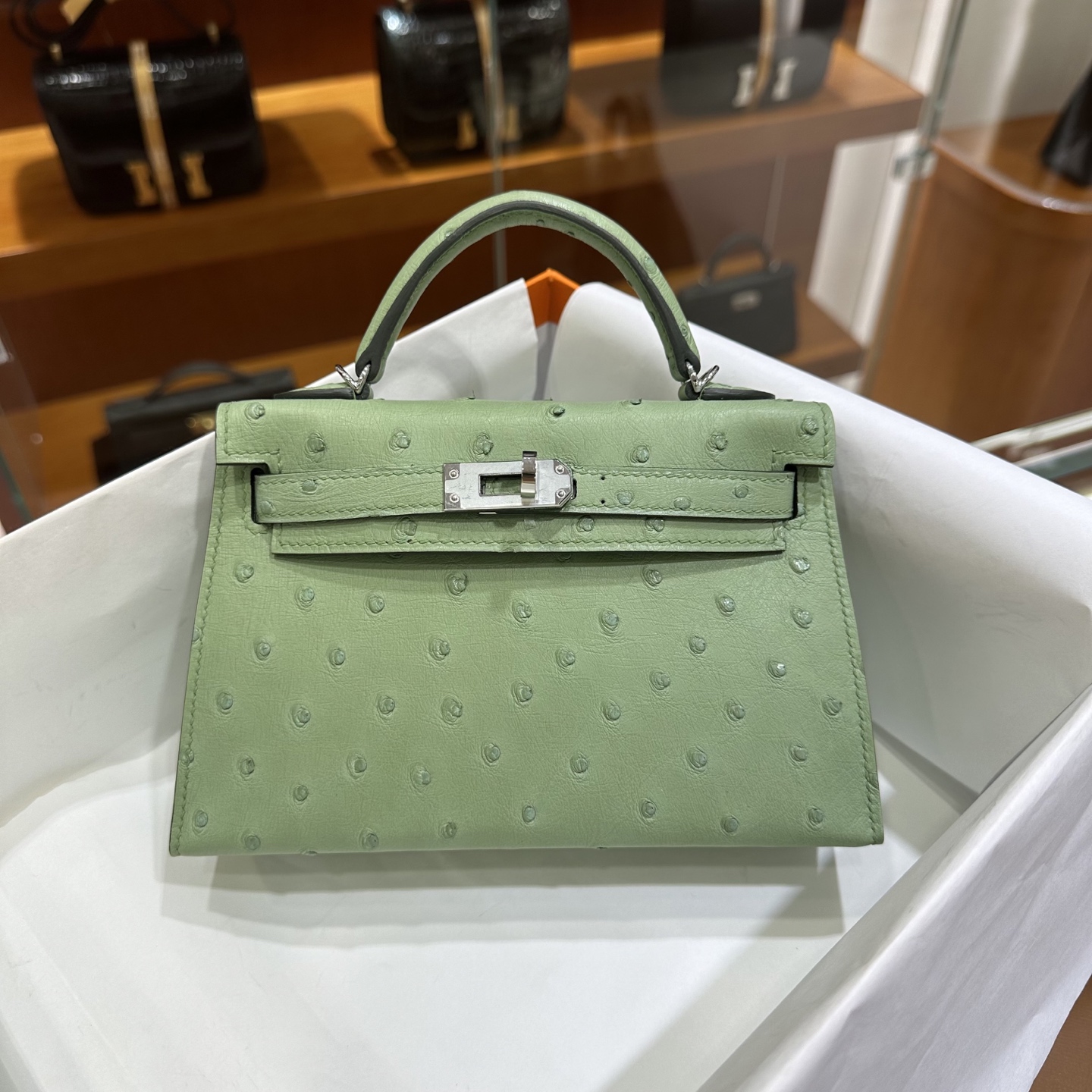 DDMode Mini Kelly Ostrich Leather 3i Avocado Green Silver Hardware 19cm Full Handmade