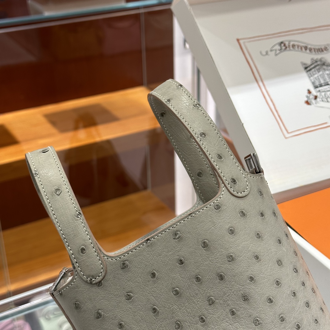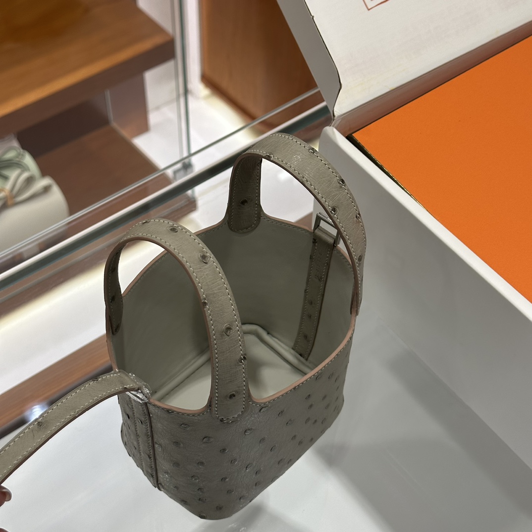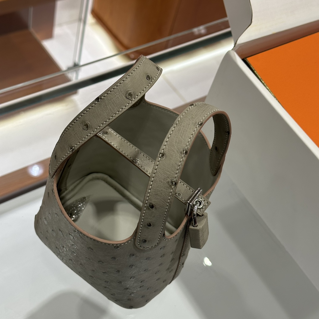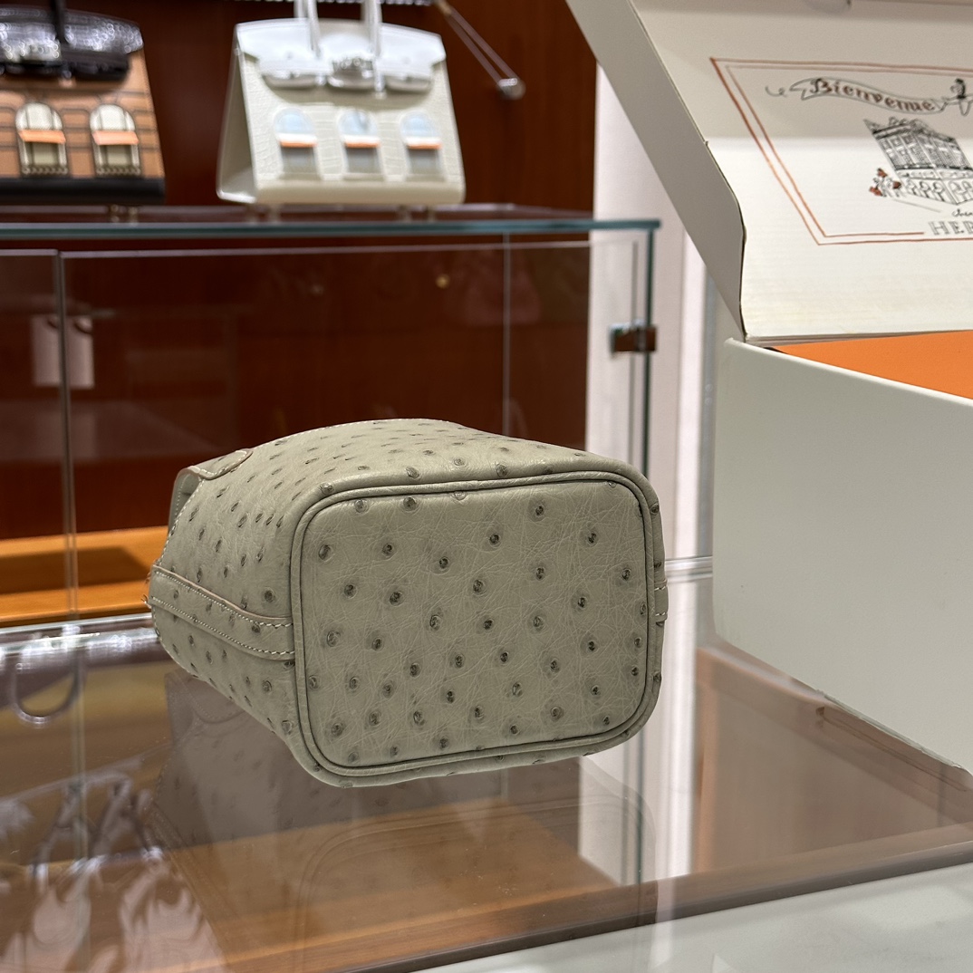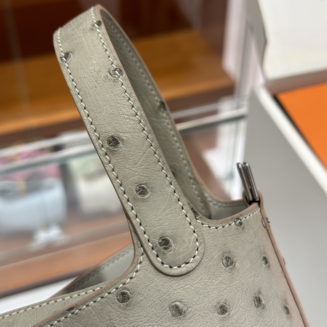 DDMode Mini Picotin Ostrich Leather Pearl Grey Silver Hardware 18cm Full Handmade