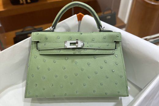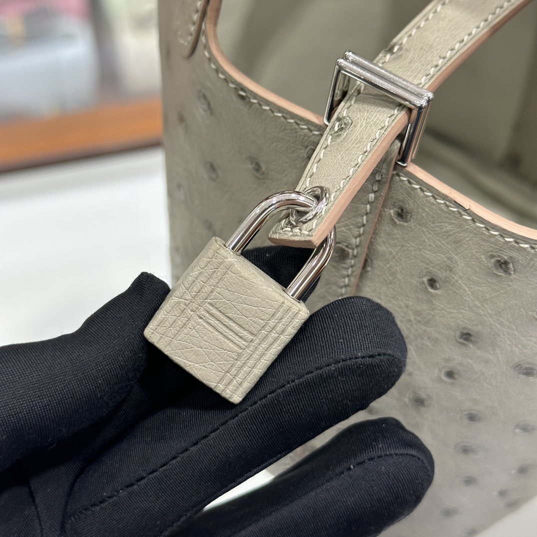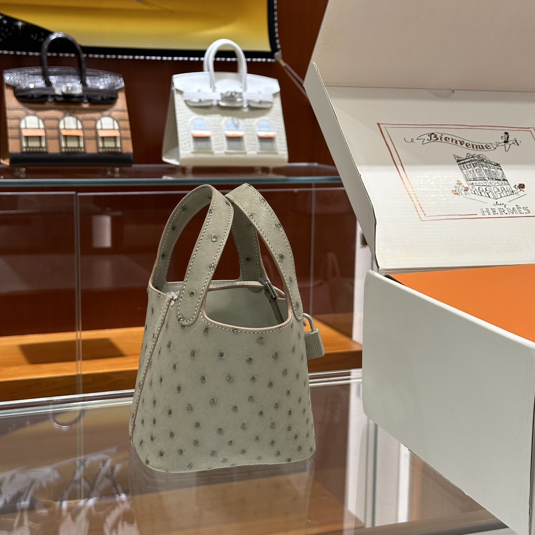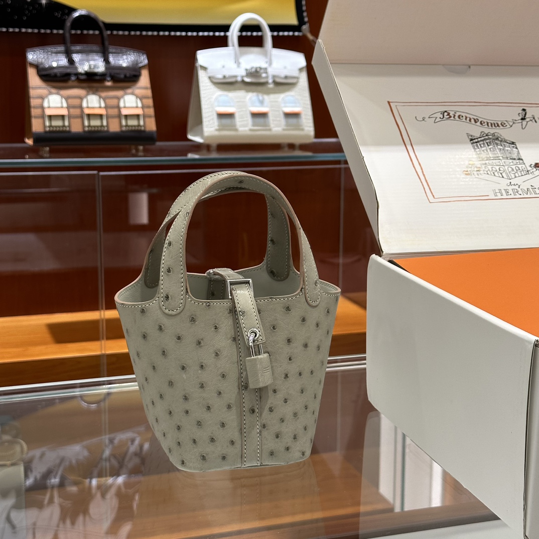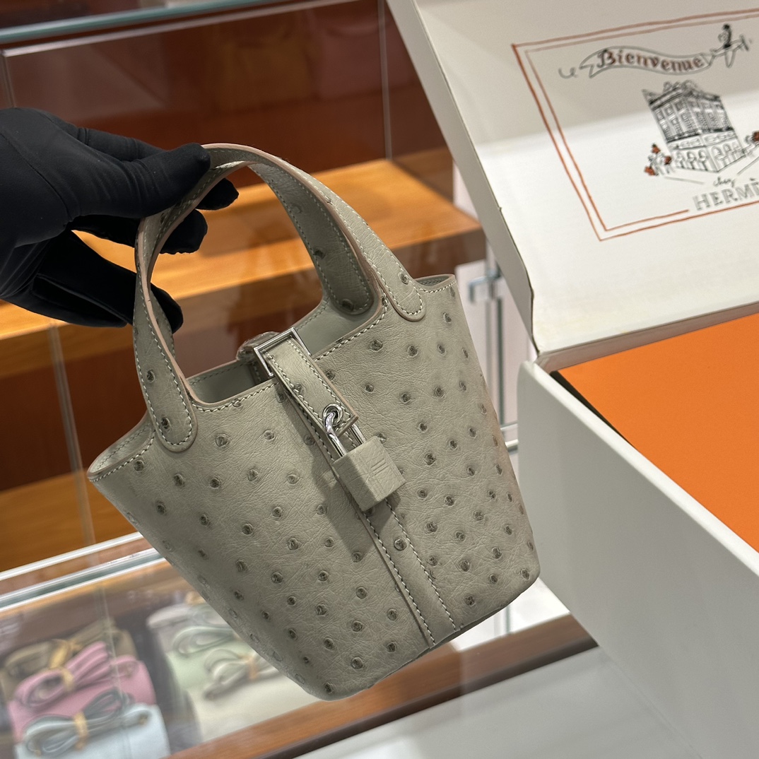 DDMode Mini Picotin Ostrich Leather Pearl Grey Silver Hardware 18cm Full Handmade